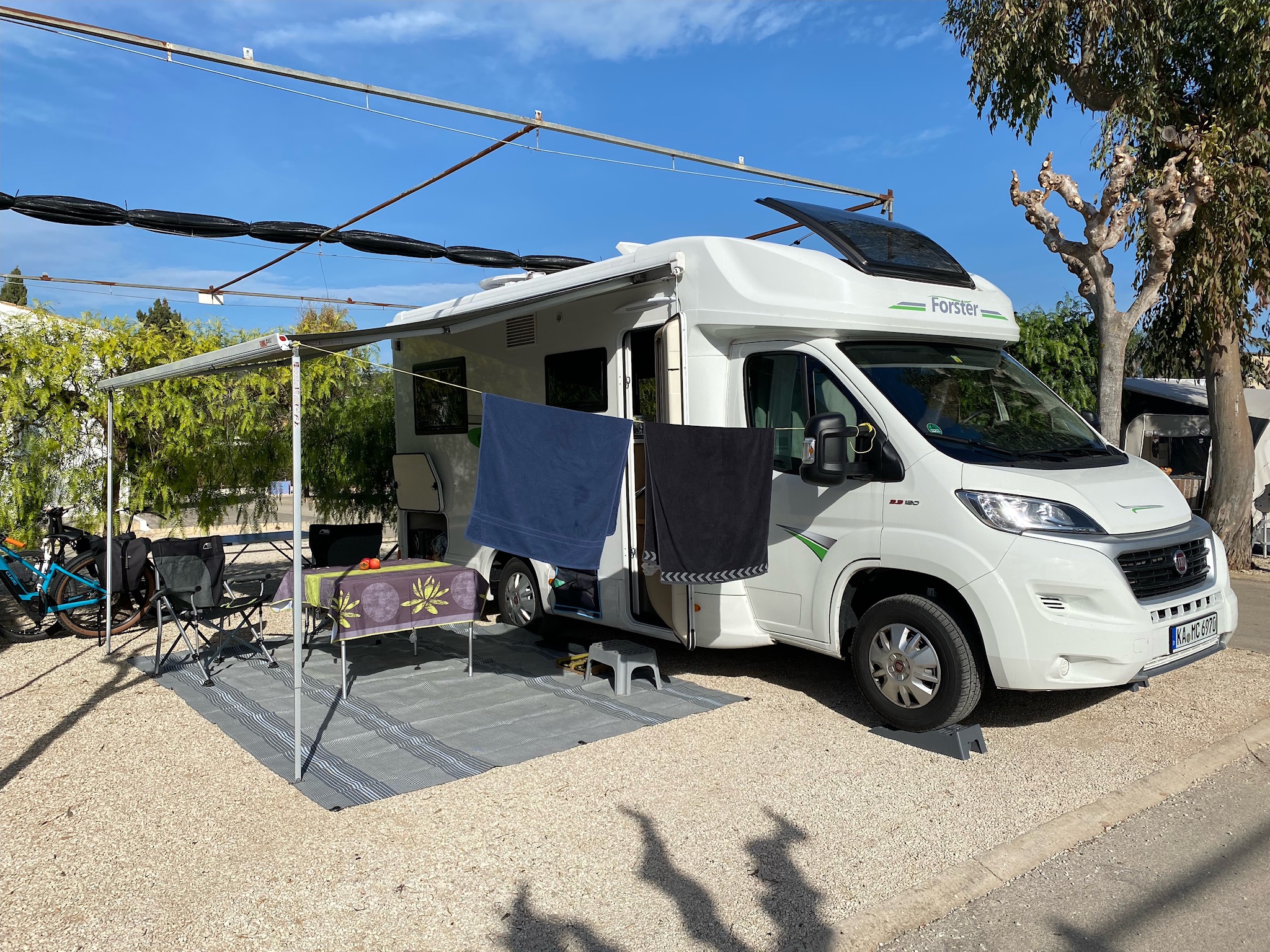Die Zufahrt zum Campingplatz führte durch ein Industriegebiet was mich erstmal stutzig machte. Aber der Platz liegt am Ende schön von Orangenhainen und Feldern umrahmt. Nett war auch, dass wir erstmal über den Platz laufen durften und uns einen Stellplatz raussuchen durften. Wir mussten aber feststellen, dass das nur einfach ist, wenn man sich über den Lieblingsstellplatz einig ist 😉. Wir einigten uns dann auf den von Claudia präferierten und von mir mit „der wird nachmittags im Schatten sein“ kommentierten Platz. Der Platz war sehr schön und nachmittags auch schattig. Das machte aber nichts, da es die Tage, die wir da waren, nachmittags meist bewölkt war. also ein klares Unentschieden.